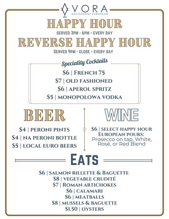At Vora, our menu features timeless European cuisine focused on traditional French and Italian dishes to capture the essence of cross-regional European dining. Perfectly paired with an extensive variety of Old World wines, craft European beer, and masterfully curated cocktails, Vora offers itself to our patrons as a window into a dining experience once far off, now so close as just around the corner.